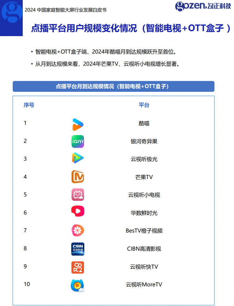 2024年,我国智能电视家庭用户超过3.36亿户,渗透率近7成。在OTT+电视盒子端,酷喵月活家庭用户达1.35亿,日活家庭用户0.51亿,均领跑行业。 银河奇异果和云视听极光分列第二、第三位。